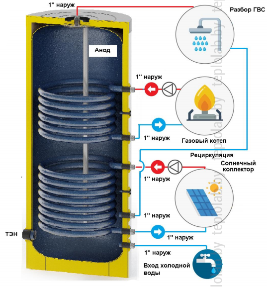 При круглогодичном использовании бака, в момент перехода на летний период, когда нет необходимости в отоплении, можно оставить бак для горячего водоснабжения от котла или теплового насоса, настроив при этом систему на поддержание температуры в баке на необходимом уровне.
