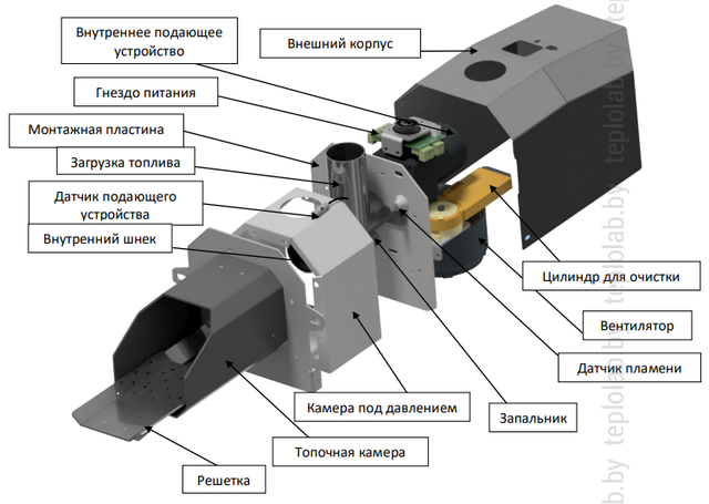 - работает на всех типах пеллет 6-8 мм (дерево, лузга, солома);